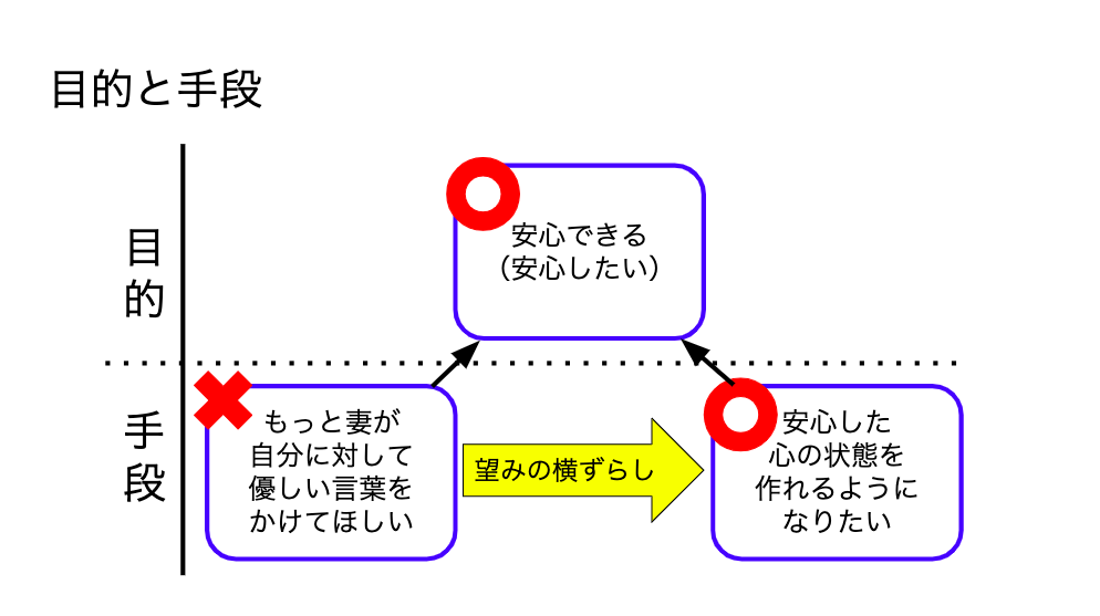 その時ってたぶん、この手段で達成したい目的っていうのが「安心できる」の他に別のものもあるからなんですよ。別の手段にしちゃうとこっち(右の目的)が叶わなくなっちゃうからダメなんです。
